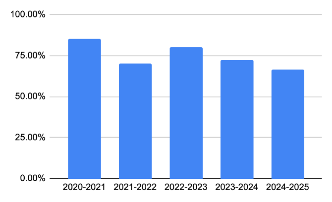 | 2024-2025* | 68% | 25 |